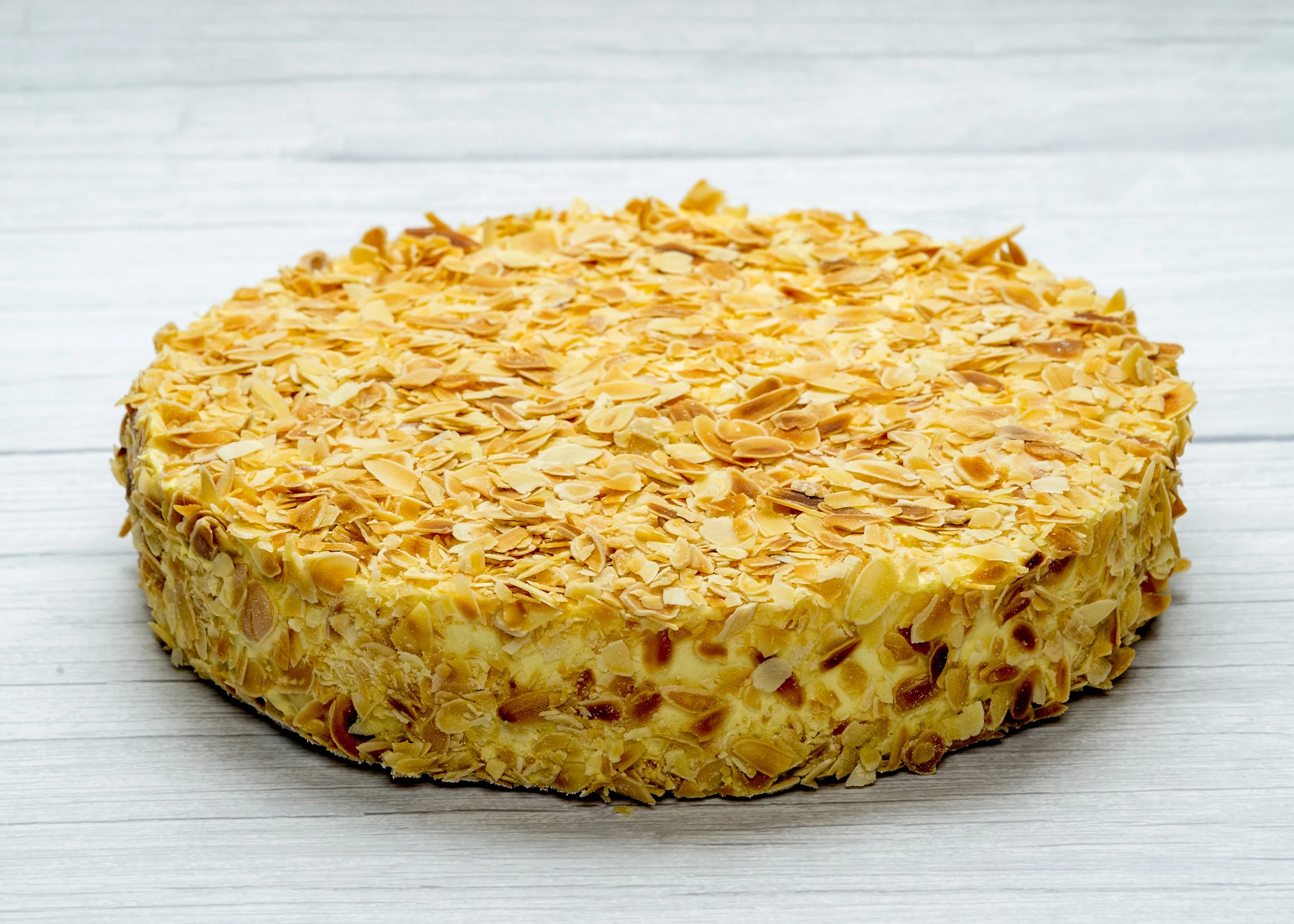 Korpus tejto výnimočnej torty tvoria jemné mandľové bezlepkové pláty, ktoré sú plnené vajíčkovo-vanilkovým krémom. Torta bohato obalená praženými mandľovými hoblinami.